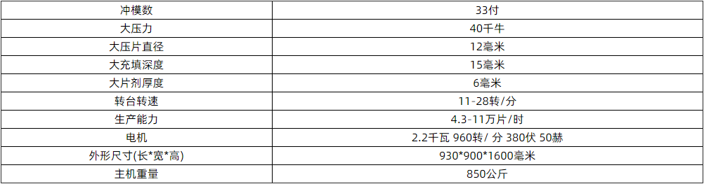 機用以將各種顆粒狀原料壓制成圓片狀,是適合批量生產(chǎn)的基本設(shè)備。其結(jié)構(gòu)為雙壓式,有兩套加料裝置和兩套壓輪。轉(zhuǎn)盤上可裝33付沖模,旋轉(zhuǎn)一周即可壓制66片。壓片時轉(zhuǎn)盤的速度,物料的充填深度、壓片厚度均可調(diào)節(jié)。機上的機械緩行裝置可避免因過載而引起的機件損壞。機內(nèi)配有吸粉箱,通過吸嘴可吸取機器運轉(zhuǎn)時所產(chǎn)生的粉塵,避免粘結(jié)堵塞,并可回收原料重新使用。