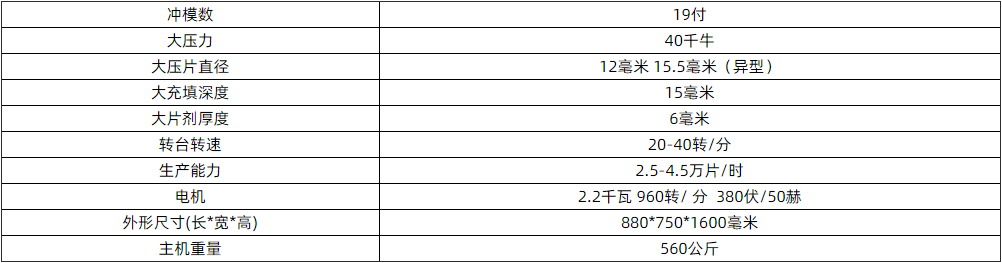 本機用以將各種顆粒狀原料壓制成圓形片劑,適合于小批量生產(chǎn)。其特點是轉(zhuǎn)盤上可裝19付沖模,旋轉(zhuǎn)一周即可壓制19片。轉(zhuǎn)盤速度、物料的充填深度、壓片厚度均可調(diào)節(jié)。機上的機械緩沖裝置可避免過載引起的機件損壞。機體一側(cè)配有吸粉箱,通過吸取機器運轉(zhuǎn)時產(chǎn)生的粉塵,避免粘結(jié)堵塞。本機曾獲國家醫(yī)藥管理局產(chǎn)品獎。